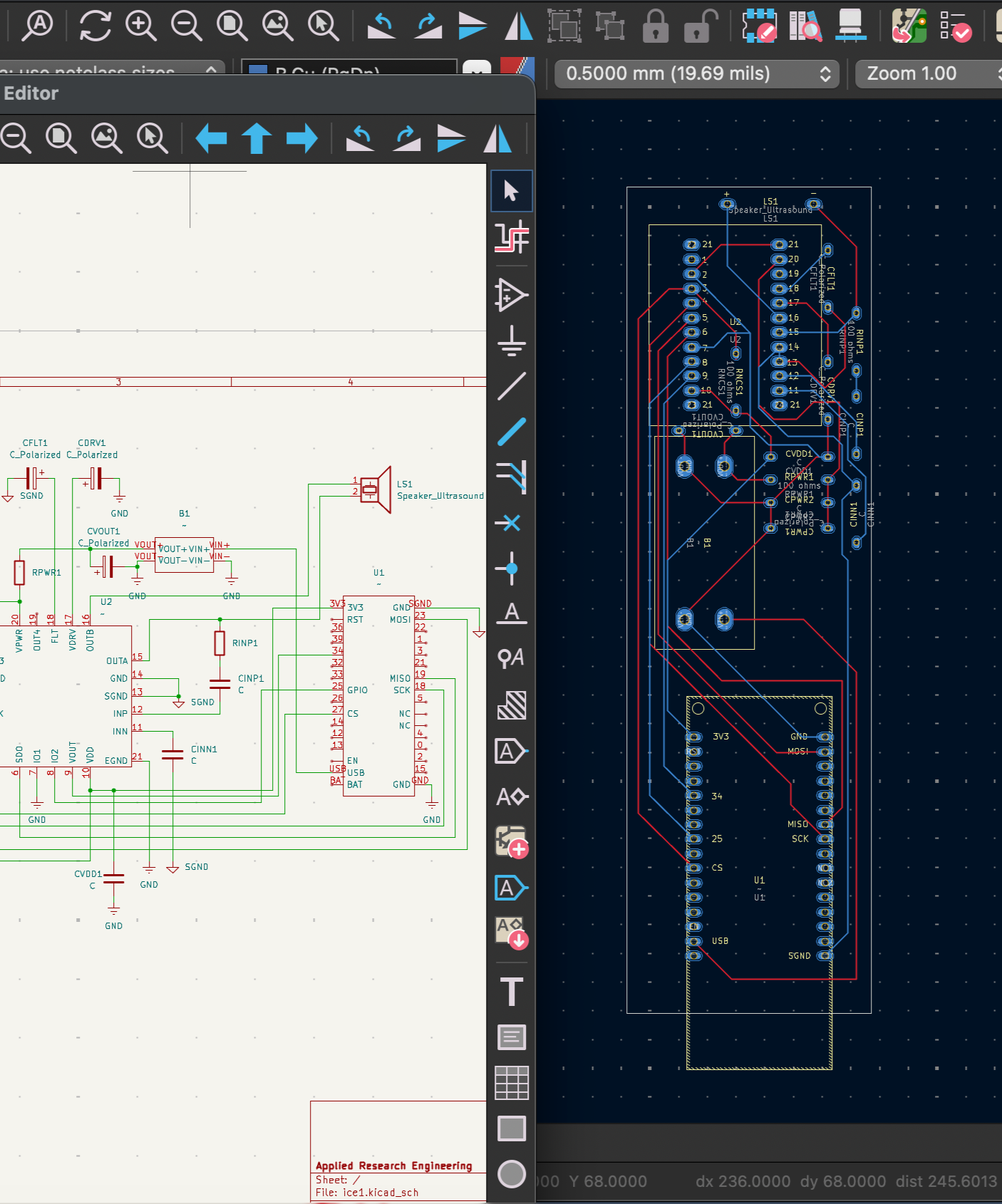 The PCB has 2 layers, allowing separation of some of the analog and digital signal carriers. The long portrait outline is so that it can fit easily in the handle of the casing, with the transducer connected at the top of the circuit.